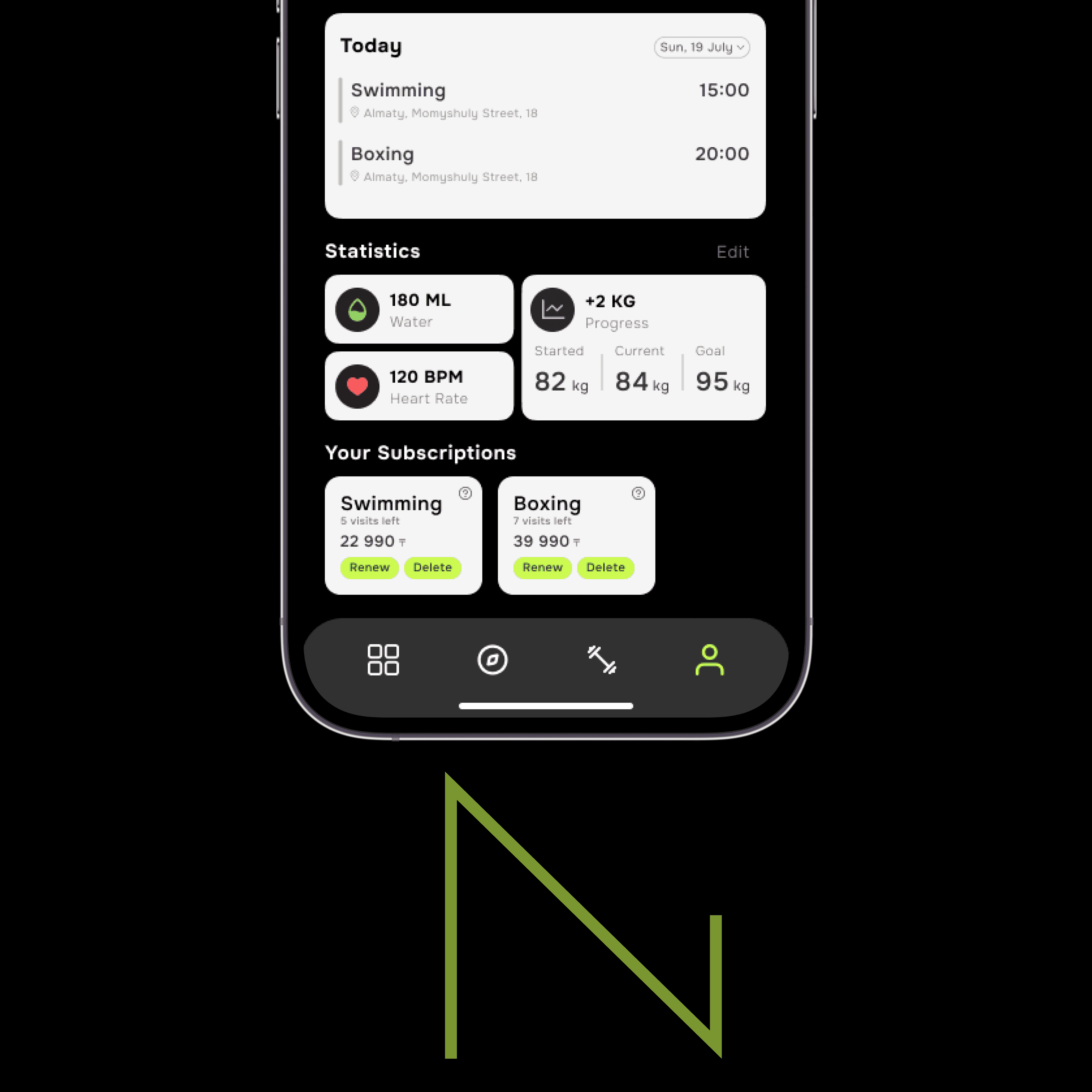 From the project keywords and your portfolio style, strong visual rhythm, use of consistent iconography, and a fitness-centric color palette are part of the design’s visual language.